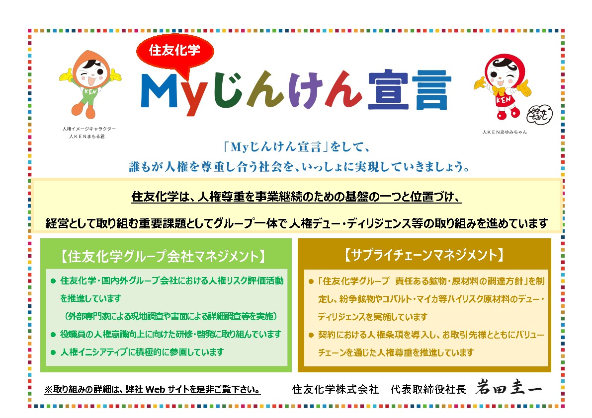 - 住友化学は、人権尊重を事業継続のための基盤の一つと位置づけ、経営として取り組む重要課題としてグループ一体で人権デュー・ディリジェンス等の取り組みを進めています【住友化学グループ会社マネジメント】●住友化学・国内外グループ会社における人権リスク評価活動を推進しています(外部専門家による現地調査や書面による詳細調査等を実施)●役職員の人権意識向上に向けた研修・啓発に取り組んでいます●人権イニシアティブに積極的に参画しています【サプライチェーンマネジメント】●「住友化学グループ 責任ある鉱物・原材料の調達方針」を制定し、紛争鉱物やコバルト・マイカ等ハイリスク原材料のデュー・ディリジェンスを実施しています●契約における人権条項を導入し、お取引先様とともにバリューチェーンを通じた人権尊重を推進しています※取り組みの詳細は、弊社Webサイトを是非ご覧下さい。