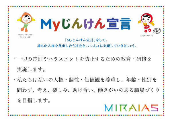 - ・私たちは互いの人権・個性・価値観を尊重し、年齢・性別を問わず、考え、楽しみ、助け合い、働きがいのある職場づくりを目指します。