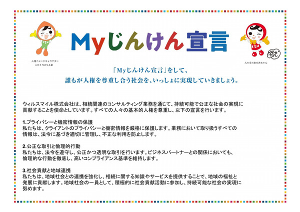 • ウィルスマイル株式会社は、相続関連のコンサルティング業務を通じて、持続可能で公正な社会の実現に貢献することを使命としています。すべての人々の基本的人権を尊重し、以下の宣言を行います。