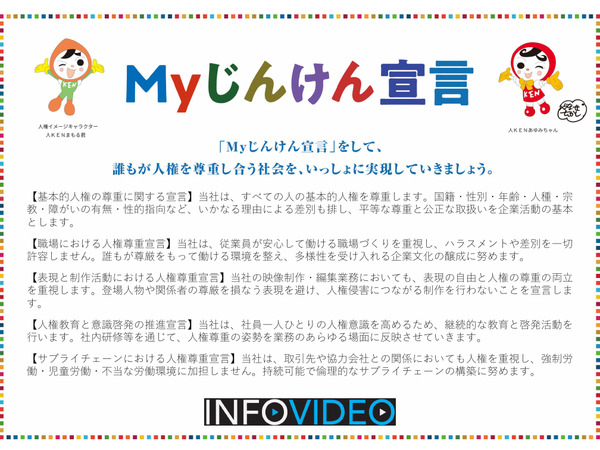- 当社の映像制作・編集業務においても、表現の自由と人権の尊重の両立を重視します。登場人物や関係者の尊厳を損なう表現を避け、人権侵害につながる制作を行わないことを宣言します。