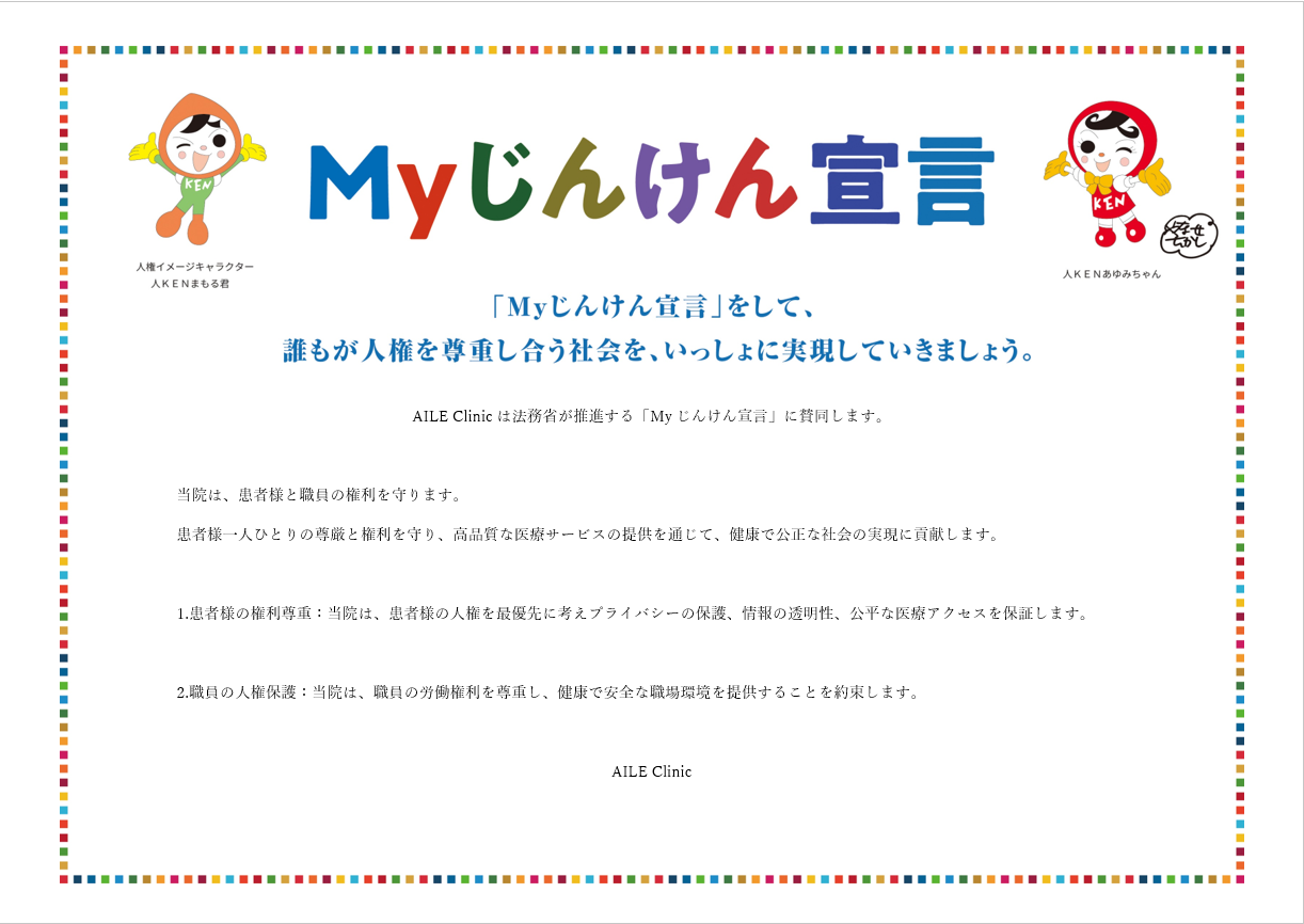 - AILE Clinicは法務省が推進する「Myじんけん宣言」に賛同します。