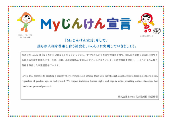 - 株式会社Levelaは『なりたい自分になる』をミッションとし、すべての人が平等に学習機会を得て、個人の可能性を最大限発揮できる社会の実現を目指します。性別、年齢、出身に関わらず誰もがアクセスできるオンライン教育環境を提供し、一人ひとりの人権と尊厳を尊重した事業運営を行います。