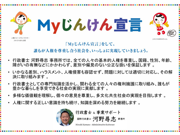 - ・行政書士 河野尋志 事務所では、全ての人々の基本的人権を尊重し、国籍、性別、年齢、障がいの有無などにかかわらず、差別や偏見のない公正な扱いを保証します。