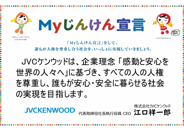 - JVCケンウッドは、企業理念 「感動と安心を世界の人々へ」に基づき、すべての人の人権を尊重し、誰もが安心・安全に暮らせる社会の実現を目指します。