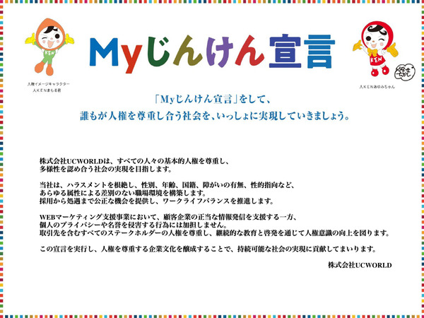 - 株式会社UCWORLDは、すべての人々の基本的人権を尊重し、多様性を認め合う社会の実現を目指します。