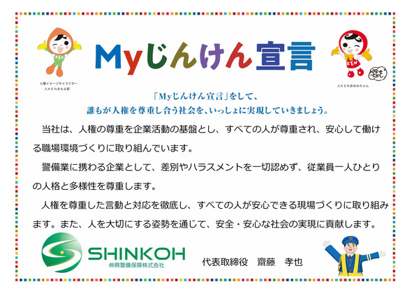 - 人権を尊重した言動と対応を徹底し、すべての人が安心できる現場づくりに取り組みます。また、人を大切にする姿勢を通じて、安全・安心な社会の実現に貢献します。