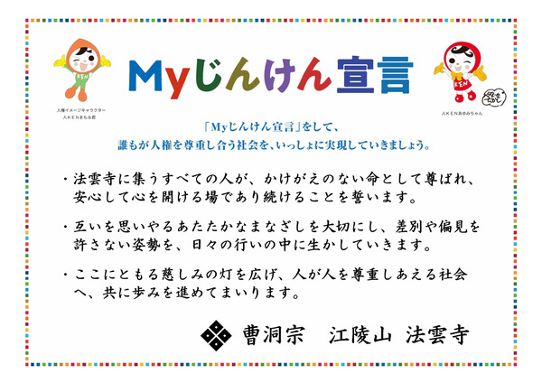- ・法雲寺に集うすべての人が、かけがえのない命として尊ばれ、安心して心を開ける場であり続けることを誓います。
